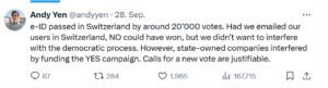 Andy Yen, Gründer und CEO des Technologie-Unternehmens Proton und früher Teilchenphysiker am CERN in Genf, lässt in einem Social-Media-Post auf «X» keine Zweifel offen, dass er die Abstimmung die soeben in der Schweiz über die Bühne ging, nicht für sauber hält: