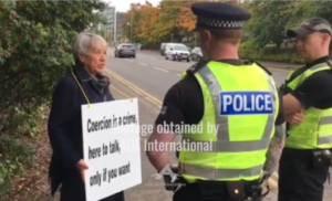 Dochertys «Verbrechen» bestand darin, in der Nähe des Queen Elizabeth University Hospital ein Schild zu halten mit den Worten «Coercion is a crime, here to talk, only if you want» (Nötigung ist strafbar, ich bin da, wenn du reden möchtest).